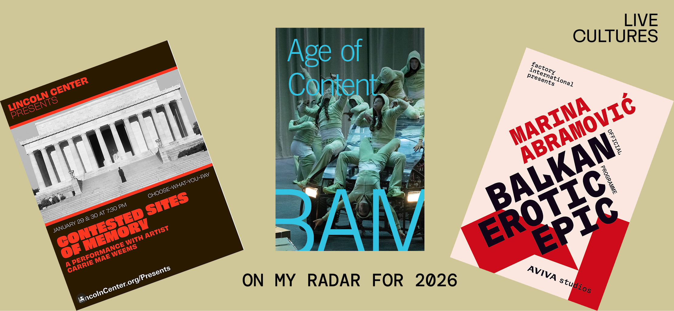 2026 already has some heavy hitters on the line up including a performance from THE Carrie Mae Weems at Lincoln Center, La Horde’s Age of Content (I saw this earlier this year in London — its fantastic!), and Marina Abramovic’s Balkan Erotic Epic — this premiered this year in Manchester, and from what I saw this really was an epic of durational performance and scale.